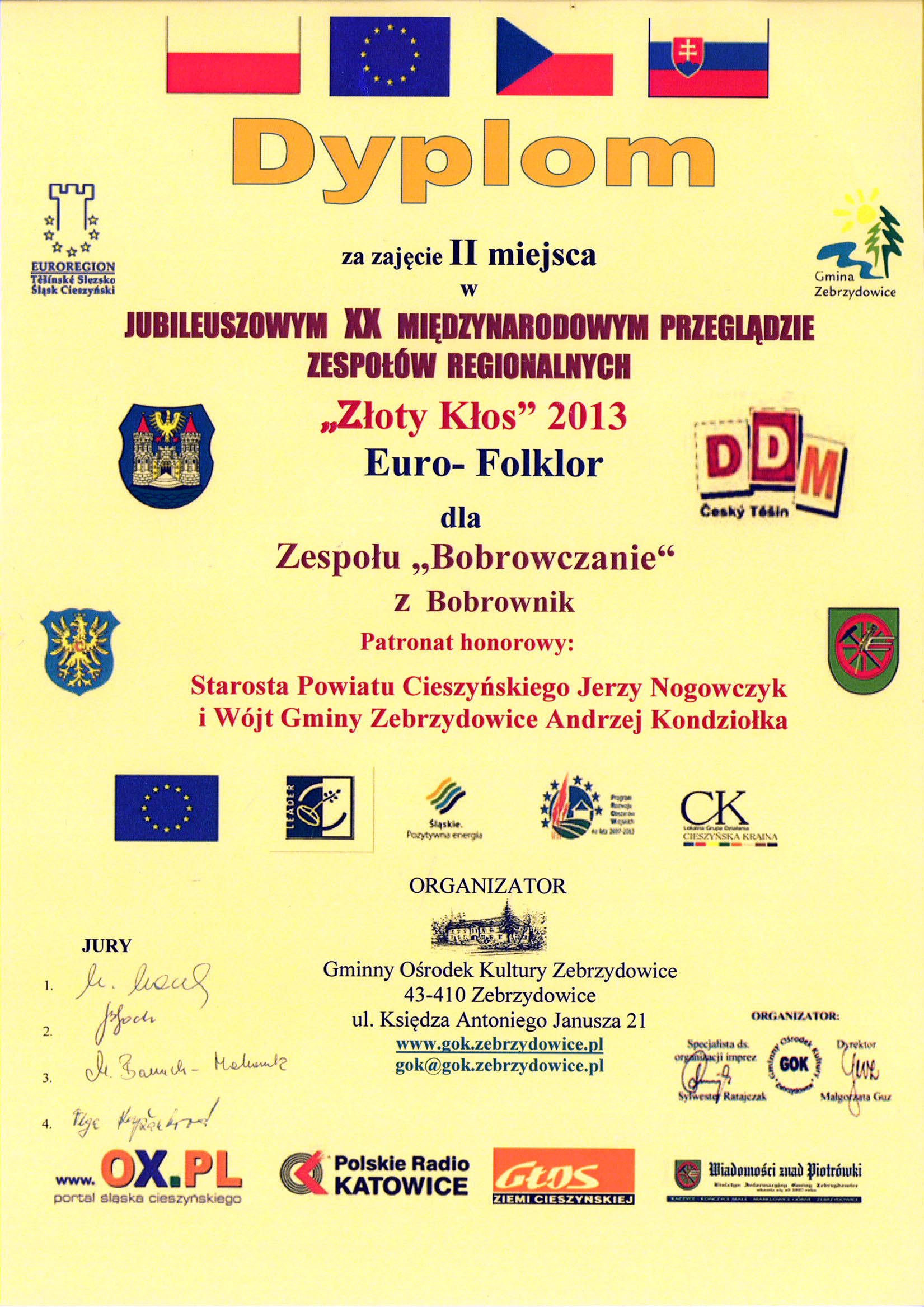 2013-05-23 14:09:05 T.S.Gratulacje dla całego Zespołu "BOBROWCZANIE" i p. Hani Rabsztyn.Zajęcie 2-go miejsca wśród 123 Zespołów w Międzynarodowym Przeglądzie to wielka sprawa.Mieszkańcy Bobrownik są z was dumni.