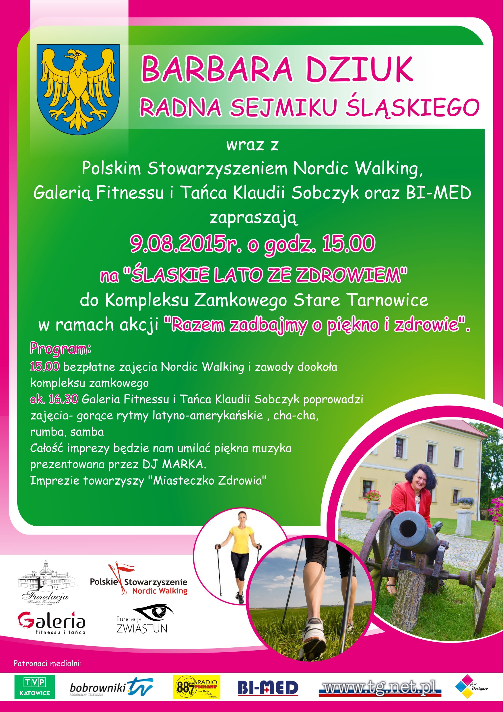 9.08.2015r. na godzinę 15.00 Barbara Dziuk Radna Sejmiku Śląskiego zaprasza wraz z Polskim Stowarzyszeniem Nordic Walking, Galerią Fitnessu i Tańca Klaudii