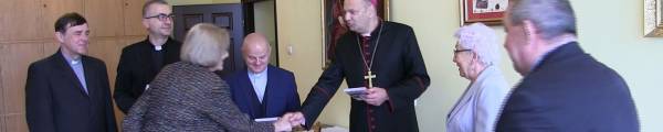 Przekazanie pamiątkowego filmu dla ks. Biskupa Grzegorza Kaszaka