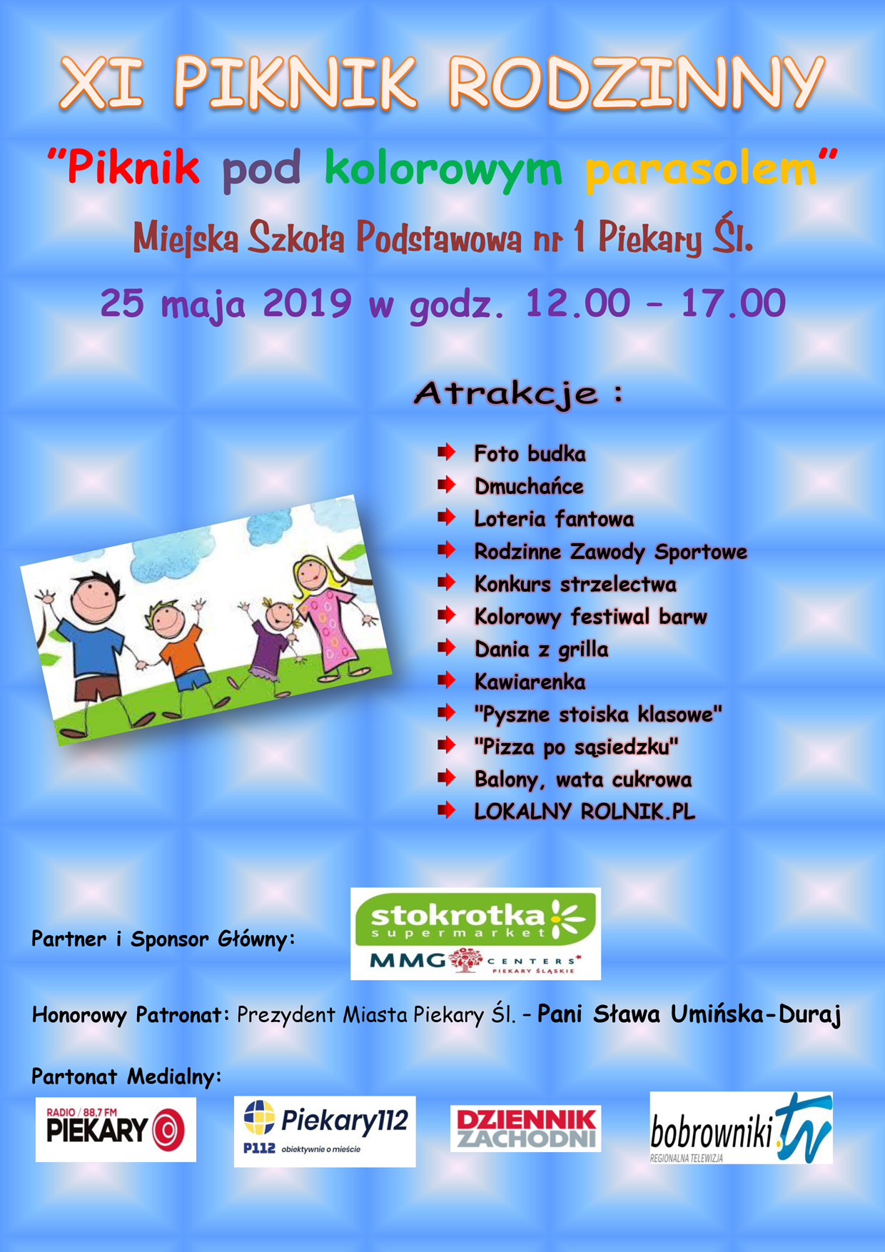 Dyrekcja i społeczność uczniowska Miejskiej Szkoły Podstawowej nr 1 w Piekarach Śląskich zaprasza na XI Piknik Rodzinny pod hasłem „Piknik pod kolorowym parasolem”.